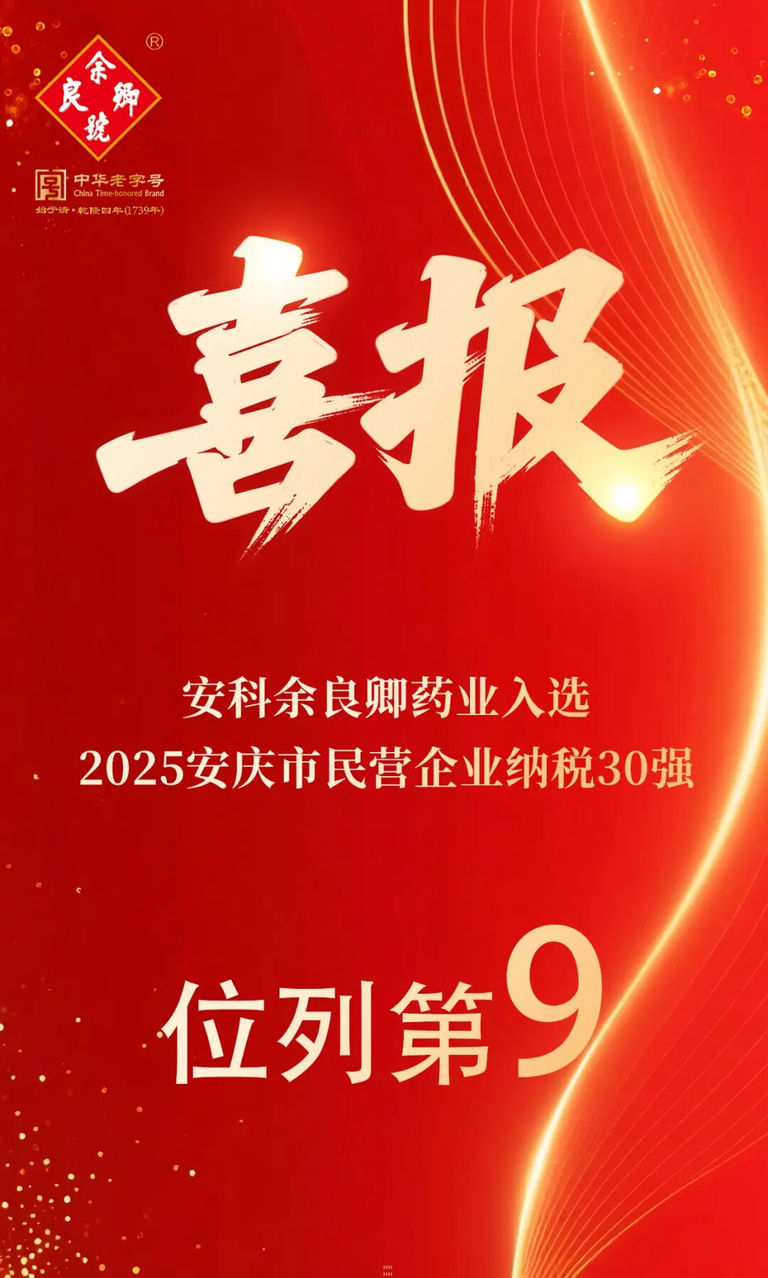 近日,安庆市工商业联合会正式公示(发布)2025年度安庆市民营企业系列榜单。经安庆市委常委会会议研究认定,安徽安科余良卿药业有限公司(以下简称“安科余良卿”)凭借卓越的税收贡献,成功入选“2025安庆市民营企业纳税30强”榜单,并位列第九位。