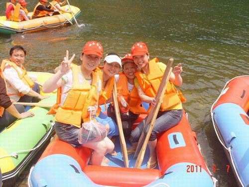 午饭后,大家前往秋浦河怪潭漂流。烈日当头,清水浠浠,闪着粼粼波光的河水仿佛在招唤着人们快快进入凉爽水域。套上防护服,手拿木桨,跳入皮筏,刚起步便遇到急流一跃周身湿透,久违了与自然亲近的员工们嬉戏声不绝于耳,河水荡起的是快乐的喧嚣,酣畅淋漓的笑声演泽成最动听的歌谣。