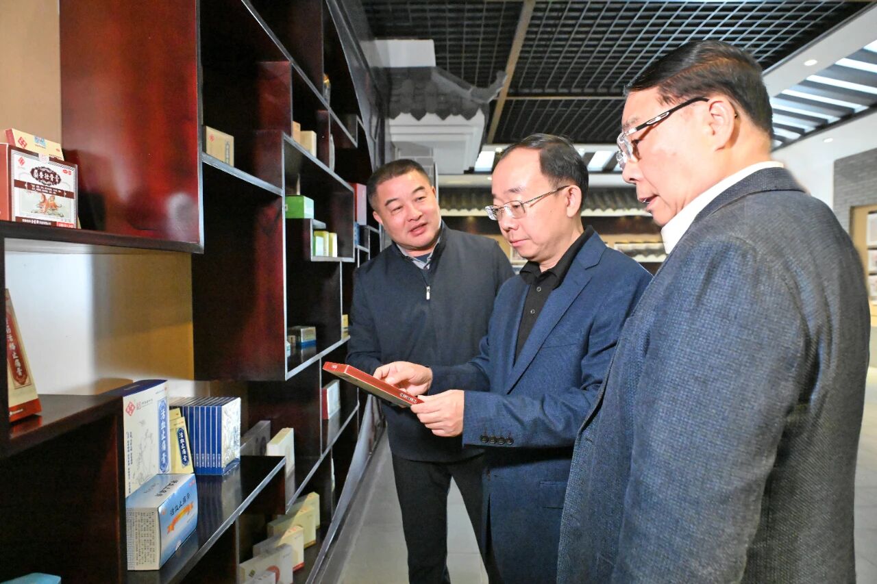 孟景伟书记一行首先参观了余良卿企业历史展厅,在一幅幅老照片、一件件历代产品实物与荣誉证书前驻足察看。宋礼华董事长详细介绍了企业自 1739 年创立以来的发展脉络,从传统中医药技艺的传承坚守,到融入安科生物集团后的创新突破,系统阐述了这一 “中华老字号” 近三个世纪来的历史积淀与时代价值。孟景伟不时提问,深入了解企业在不同发展阶段的核心产品、工艺特色,以及如何将家国情怀融入品牌发展,对企业深耕中医药领域、讲好安庆本土品牌故事的思路给予肯定。